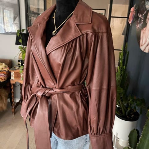 Dette plagget er laget av ekte lammeskinn og har glidelås, et belte i midjen og tre lommer.
