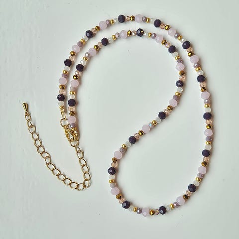 Håndlaget armbånd med små gullfargede perler, ekte ametyst og ekte skjell-perle.