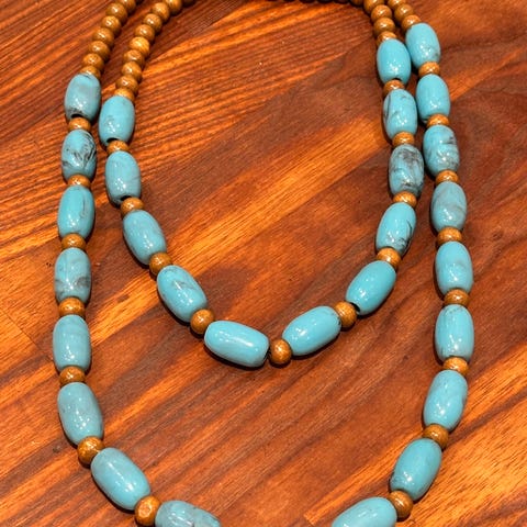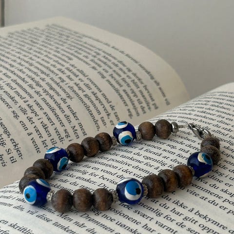 Håndlaget armbånd med turkise perler, gullfargede filigree-perler og evil eye perle.