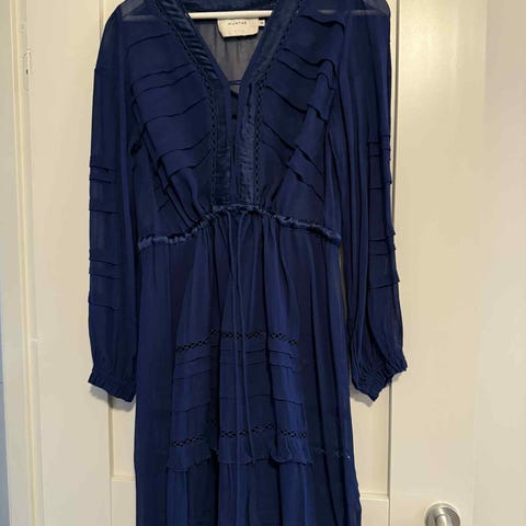 Veldig pen kjole fra Munthe i Polyester og elastan, som gjør den "fin" i kvaliteten og stram i stoffet . Den er en slags gammelrosa, klassisk kjole med blomstrete mønster . Brukt til 17.mai og én konfirmasjon .