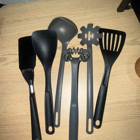 Liten kjøkkenpakke med øse, hullsleiv, pinsett, potetskreller og en universal peeler. Selges samlet. Hentes i Tønsberg.