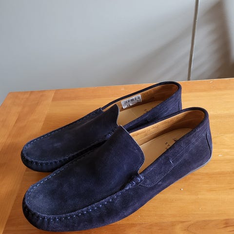 Håndlagede loafers i semsket skinn i nydelig blåfarge. Fargen er litt lysere enn på bildene.