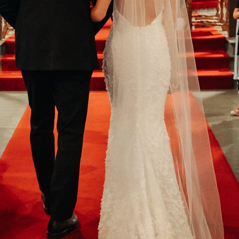 Har også fått laget matchende blonde-hansker av samme designer som hører til kjolen. Ny pris: 4.500kr. Kan medfølge for 3.000kr.