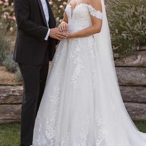 Lufter interessen for denne vakre brudekjolen med i blonder fra Alena Leena (modell: Iberis).✨Jeg har kjøpt kjolen på White by Green og den vil bli brukt noen timer (skal bruke en annen på kvelden) på bryllupsdagen min den 20. juni 2026. Dette er en kjole det er høy etterspørsel etter med 6-7 måneders leveringstid.