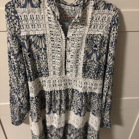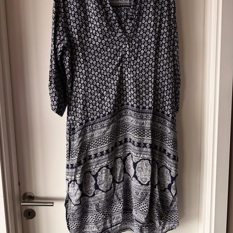 Meget pen kjole. Brukt kun en gang.Farge: blå og hvit. Den går til kne. Stoff som ikke krøller. Str M. Kan sendes med posten eller postnord. Se gjerne mine andre annonser.