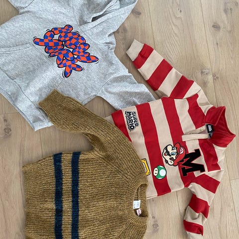 Stripete tynn genser og ribbestrikket foret jakke i bomull fra Sfera. Passer fint sammen.