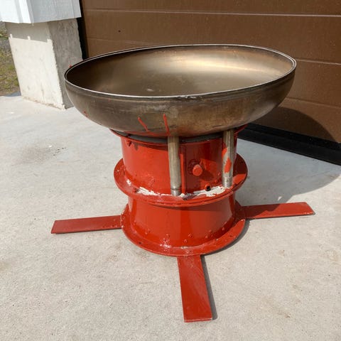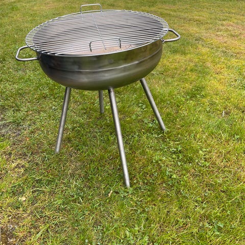 Solid bål panne / grill i rustfritt. Bunn riste er også i rustfritt og er inkludert. Diameter ca. 50cm. Høyde fra bakken til topp ca.55-60 cm. Vekt ca. 12 kg. Jeg laget en slik til film «Nordsjøen»: https://youtu.be/sqi_sJEQ5Lc