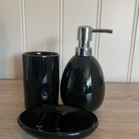 Lys beige farge (på begge) glatt/blank overflate og aluminium pumpe (på såpedispenser). Begge står i tilpasset trefat (se bilder)