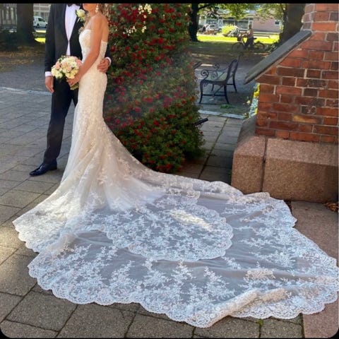 Fantastisk brudekjole fra Demetrios, pent brukt, men må renses. Size 8, sydd ganske mye inn, men kan evt sys ut. Lagt opp til meg 1.68 cm høy. Et syn av en kjole! Kjøpt på Christiane Brudesalong. Ny pris ca 29.900kr