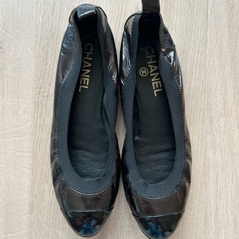 Selger disse flotte og pent brukte Chanel skoene videre. Gode å gå i. Str 38. Fått lagt på ekstra såle på hælen så de tåler mer. Kommer med orginal skopose