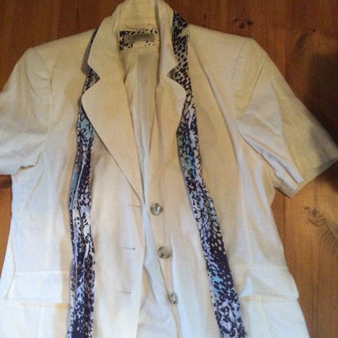 Pent brukte bluser fra Design Forum . 2 like i farger svart og lilla , med fint « skjørt « som svinger ut fra under bysten . Kledelig fasong om man har en liten mage . Viscose , blonde med Strech . Begge i str XL.