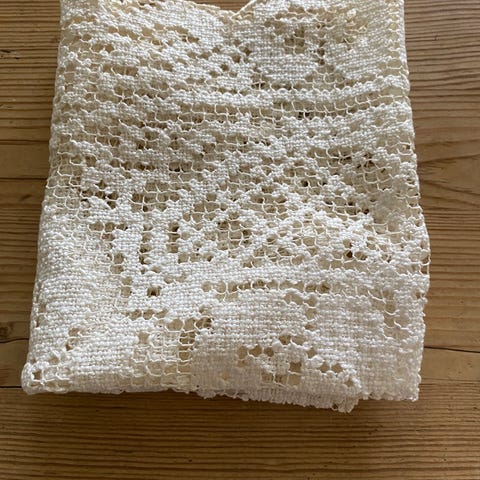 Duken er hvit og den er håndheklet i tynt bomullsgarn.