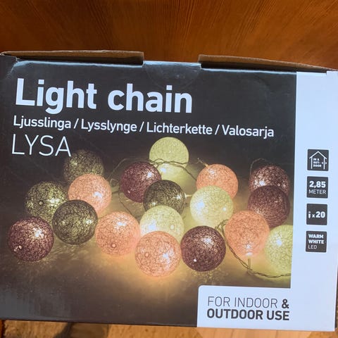 Dekorativ Led Lysslynge med 20 Led lys selges. L: 9 meter inkl. 4 meter dekor plus 5 meter kabel. For innendørs og utendørsbruk IP 44. Passer som en gave. Eska er 15x 19x 15 cm.