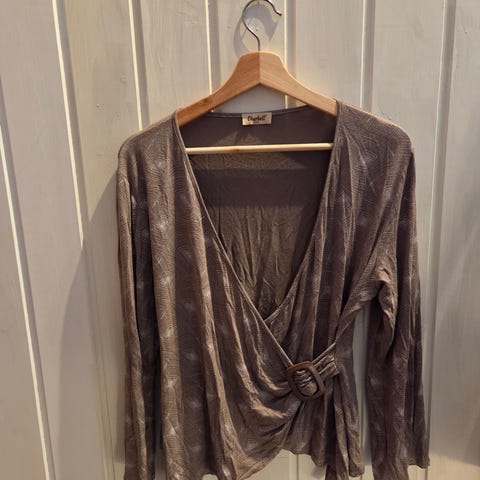 Ny/ubrukt, asymmetrisk, beige topp/genser selges. Den har et lite hull et sted, som kanskje kan sys, eller fikses på annet vis om man vil. Fra røykfritt hjem, men har katt. Noe bruksmerker kan forekomme. Selges som den er. Se bilder.