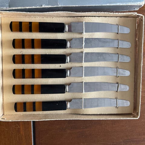 6 stk flotte retro fruktkniver fra 50/60 tallet i assorterte farger selges samlet.