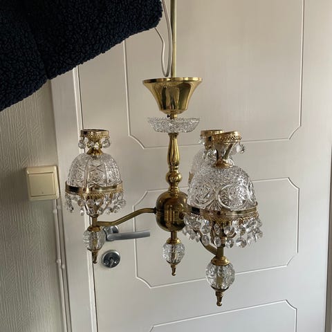 Selger flott og feilfri taklampe i forgylt messing. Krystaller av høy kvalitet, meget fint fargespill. Svenskt håndtverk. Diameter 32 cm, høyde 33 cm, høyde fra tak 96 cm ca. 3 lyspærer. Kan sendes mot at kjøper betaler frakt. Pris kan diskuteres ved rask og smidig handel. Lampetter i samme serie i en annen annonse. Se mine annonser.