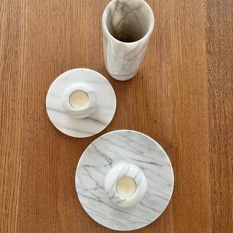To stødige glassbrikker til glass/kopp i marmor/steinlignende materiale med gullkant.