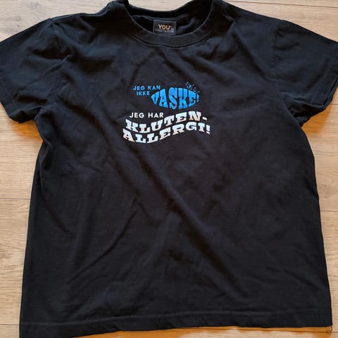 Omtrentlige mål på t-skjorten: høyde (skulder-bunn) 49 cm, bredde (under ermer) 38 cm. Passer derfor til barn i tidlig barneskolealder.
