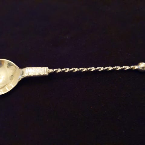 Snodd skaft, bøyd en gang rundt så det danner en sirkel. Av- sluttes m/1 rund kule. Nederste delen av skaftet er glatt. Blad -et har takker på sidene som et blad, forgylt og er inspirert av norsk bunadssølv".
