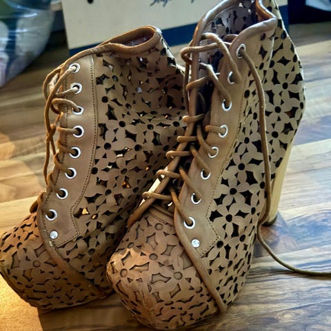 Skoene er aldri brukt, kun prøvd på innendørs, og fremstår som helt nye.