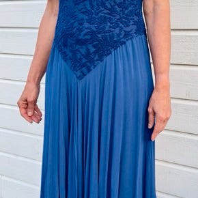 Selskapskjole i tungt stoff, faller pent. Blå farve, lange ermer i str 44 (015) og 46 (016)