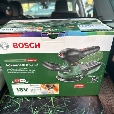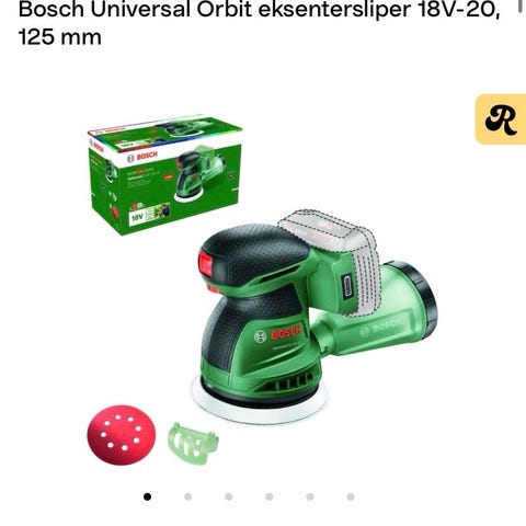 Leier ut en kraftig batteridrevet eksentersliper. Maskinen er et proffverktøy fra Bosch sin 18V serie. Det følger med lader og koffert til å frakte maskinen i leien. Den bruker slipepapir på 12.5 cm diameter. Jeg har noe slipepapir, både grovt og fint.