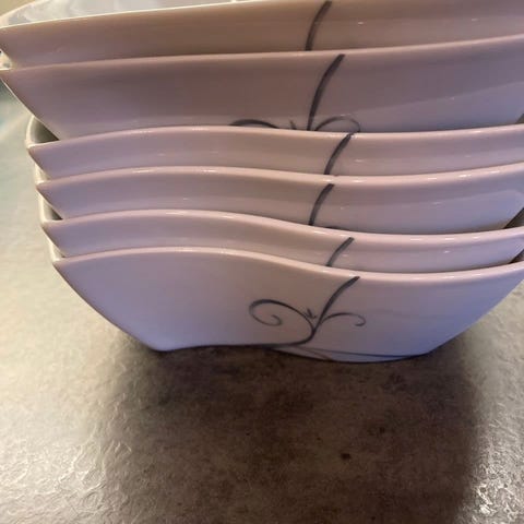 Middags fat 2 stk ,Frokost fat 2stk , Dype fat 2 stk og Små skåler 2 stk fra Victoria Service. Ikke brukt og ligget i eskene sine. Priser ligger under bildene. Må hentes.
