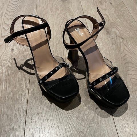 Høyhælte sko i glitter selges. Str 38