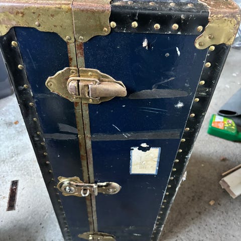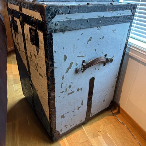 Flott gammel reisekoffert med oppheng og skuffer. Meget pen stand