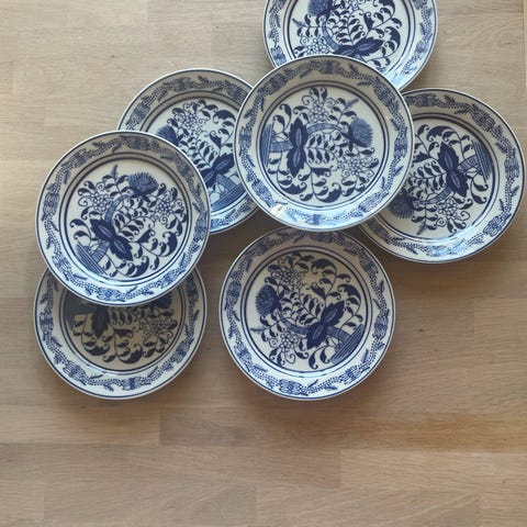 sju åttekantede tallerkener i målene 19,5cmx19,5cm,