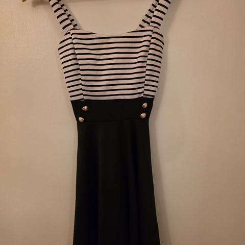 Den lille, stilige, svarte kjolen selges. Den kan være fin til jul og nyttår og fest. Stor, halv stjerne fremme på den. Litt tyll som stilkker nedenfor kanten på kjolen. Fine detaljer. Lite og pent brukt. Litt korsettaktig på overdelen. Den ble kjøpt på only for sikkert 10+ år siden. Fra røykfritt hjem, men har katt. Noe bruksmerker/slitasje kan forekomme. Selges som den er. Se bilder.