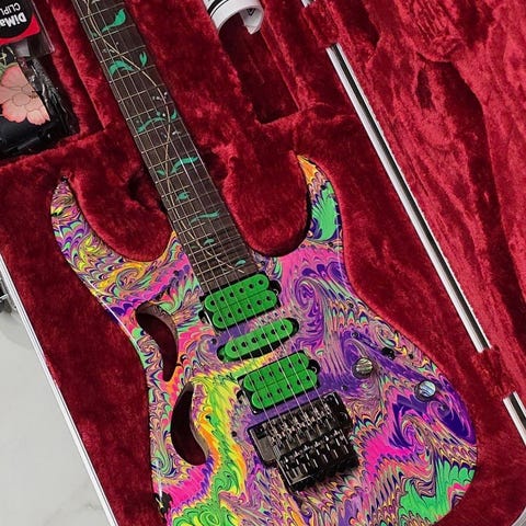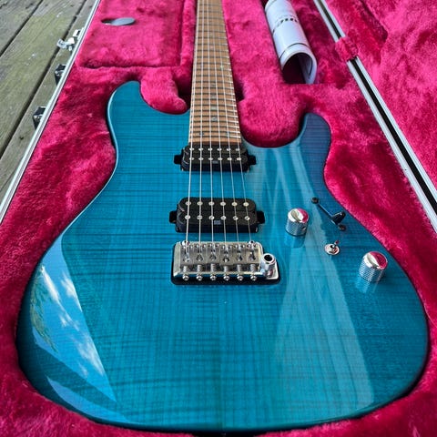 Honning roasted mahogny neck og mahogny syngende kropp, lønn topp. Plekd ss frets. Abalone inlays. Dough Aldrich suhr pups, Gotoh lo pro floyd. Føles som en wilkinson. 25" mensur. Annj bolt on. Locking tuners. Tremol-no blokkering lås for fast bridge. Helt strøken. Dire Straits Penta Suhr var populær. Steve Vai fikk prototype av en og Tom Anderson før han valgte å gå for JEM ideén.