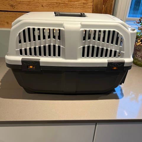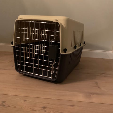 Lite hundebur i plast til små hunderaser eller katt . Kjekt å ha om man skal til veterinær eller har liten valp som skal sove en dupp:-)