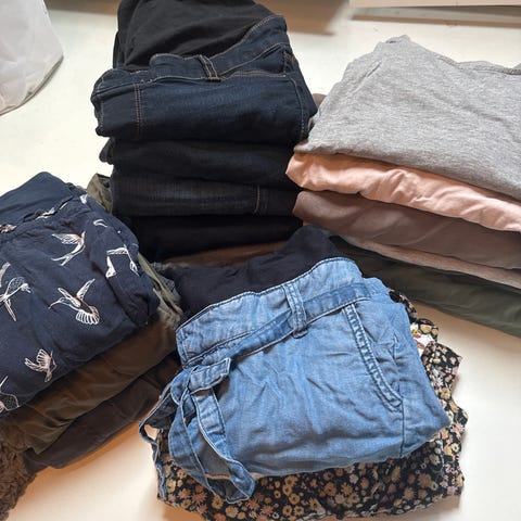 En utrolig behagelig dongerishorts fra Blooming Marvellous som ikke har stort magebelte, men behagelig lavt bredt strikk for varmere dager str 14 (L). Jeg var vanligvis str S/M før graviditeten, og jeg synes det var behagelig med litt romslige underdeler. 62% bomull, 28 % polyester og 5% elastan.