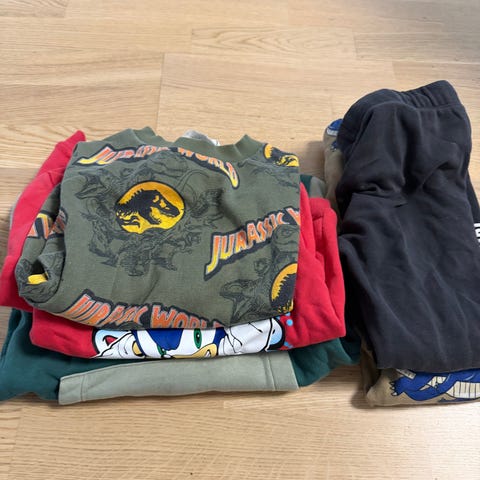 3 t-skjorter, 2 bukser, en genser og en nesten ubrukt jakke i str 128 selges samlet for kr 200,-