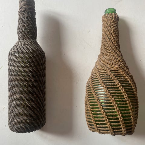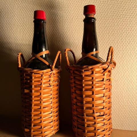 Har fire stk. Litt ulike. Ene er fylt med sand og har hull i kork.( Brukt som lampefot. ). Ca 26cm høye pluss /minus. Peddik flettet rundt flaske på 50/60-tallet. Håndlaget. Hjemmeflettet. Fine til kvister med lysslynge/en blomst ol. Selges for 155 kr pr stk. Kjøper betaler porto .