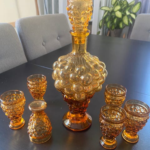 Karaffel og 6 drammeglass i brunlig pressglass fra 1974. Gevinst på tivoli i Kristiansand.