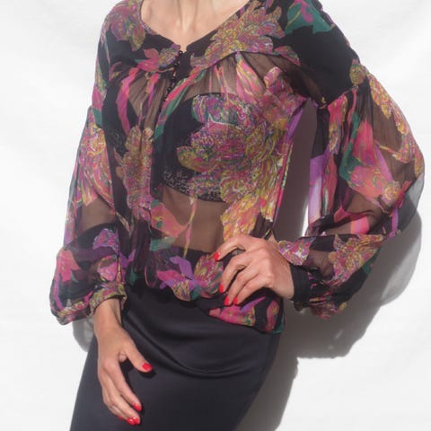 Florlett bluse med posete ermer og lange kragesnipper.