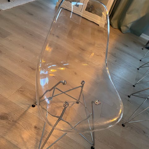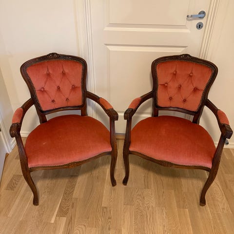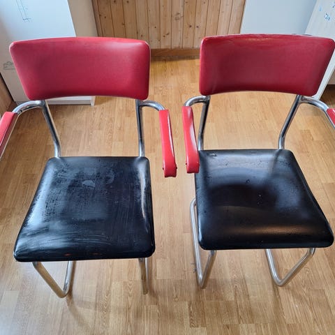 2 stk. Stoler med løse bugunder røde puter. Stolene har kun vært brukt innendørs. Selges samlet kr. 500. Må hentes i Strømmen. Har du en innglasset balkong vill den også passet fint der.