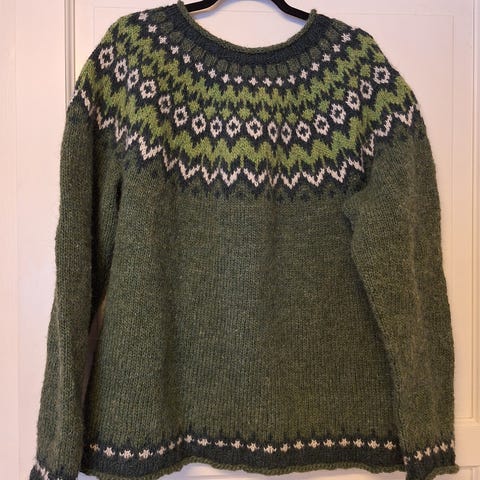 Ubrukt hjemmestrikket ullgenser, Dale oppskrift fra OL 1992. Damestørrelse ca xl. 65 cm lang, 59 cm bred, armlengde 54 cm. Sendes gjerne mot porto.