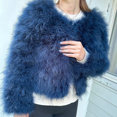 Svart jakke i 100 % ekte fjær av struts. Foret med sateng. Rund hals med lange ermer. Rekker ned til hoftene. Lukkes med hekter i front. Rens anbefales. Medium 36/38. Brystomkrets 102 cm. Rygglengde 55 cm. Denne er kjøpt på pinkyswear ( via miinto) i 2019 for 1700 kr. Denne er aldri brukt. Selges for 600kr inkl frakt med sporing.