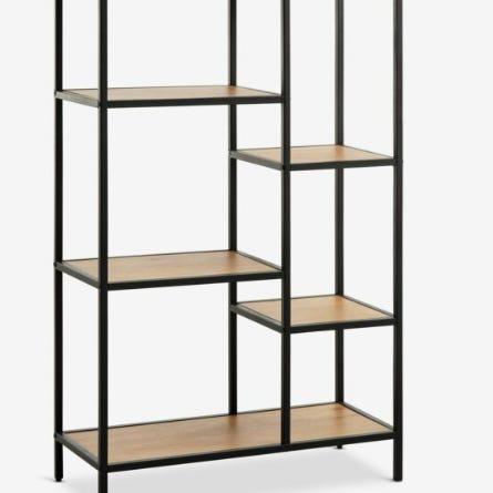 Moderne hylle med tøffe detaljer i mangotre. Ramme i sort stål