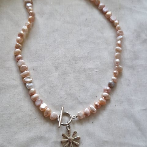 Halskjede med nydelige ovale perler. Nb. perlene er ikke ekte perler. Kombinasjon av lyse perler og perler i tre. Messingdetaljer. Følger formen på kroppen meget pent, veldig fin i ulike lys. God vintage stand.