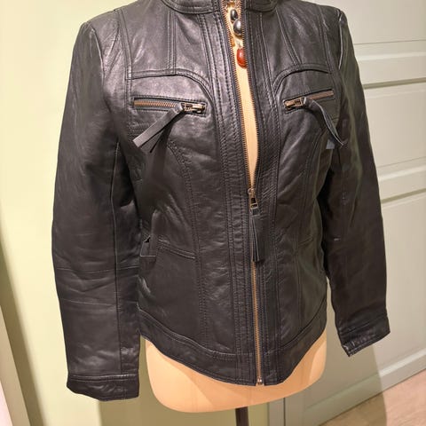 Høy kvalitet. Ny ubrukt sort pen Aleksander Signature skinnjakke. Str. 36. Mykt skinn. Color: Black Leather. Lukkes med glidelås i front. 2 lommer med glidelås. 1 innerlomme med glidelås. Style: Angela. Shell: 100% real leather. Lining: 100% polyester. Høy nypris. Røyk- og dyrefritt. Selger kr. 1.999,-. Pris er satt. Tar Vipps.