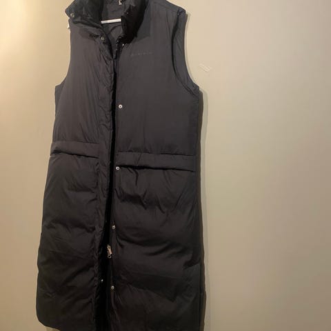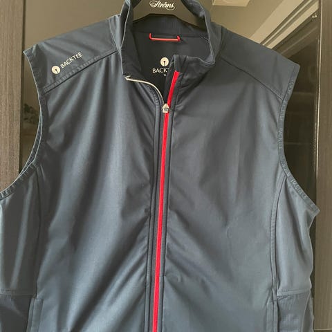 Vattert golfvest med varm polstring og stilig ståande krage. Vesten er i pustende materiale som er vind og vannavstøtende. Den er lite brukt, og selges fordi den ikke blir brukt.