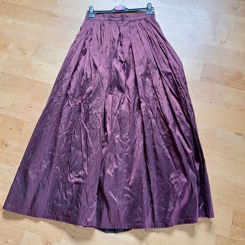 Nydelig taftskjørt fra Oleana ( norsk design) str. S, ca. 70cm livvidde. 97 cm hel lengde . Mykt plisséskjørt, som har en mørk lilla/fiolett farge m/ vakker, litt matt glans. Det er fóret og har 2 «stikklommer». Brukt i to 50-årslag... Siden godt ivaretatt !! Tilbehør livbelte/knytebelte i samme stoff, knytes foran eller bak. (Kr.400’-inkludert). Flott selskapsantrekk !! ( selv hadde jeg strikket topp og «silkesko» i samme farge. Fint konfirmsantantrekk👌. Kan sendes med Helthjem.