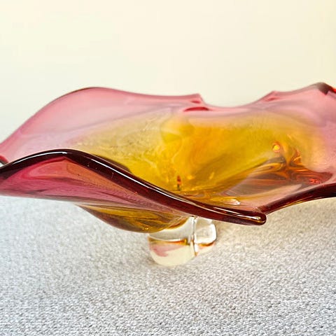 Fantastisk glass skål i rosa, klart og grønt glass, med hvite detaljer. Kunstglass fra 50 60 tallet. Designet av Josef Michal Hospodka (1923 - 1989). Tsjekkia.