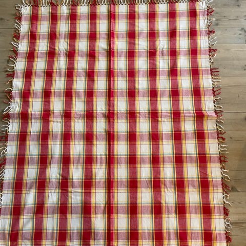 Retro duk fremstår i som ny hel pen stand. Bunnfarge lys grå, ellers farger i grønn, orange, gul. Lik på begge sider.