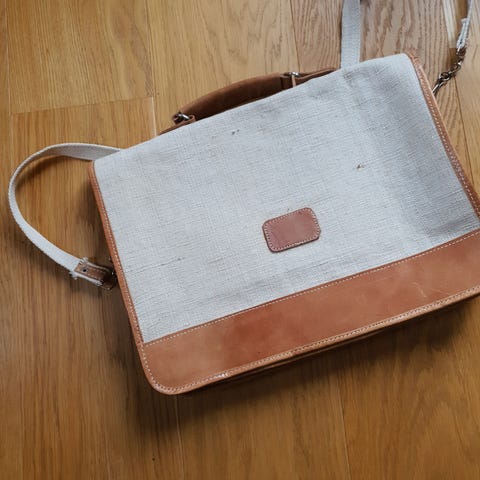 Vesken er gammel og lite brukt. Det er en praktisk veske med mange rom. Mener at den skal skal være kjøpt på 80-tallet.