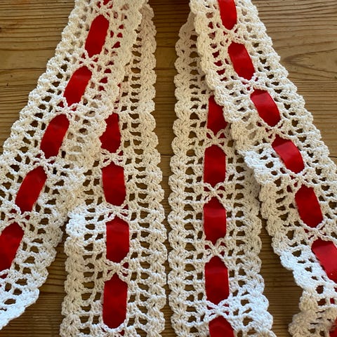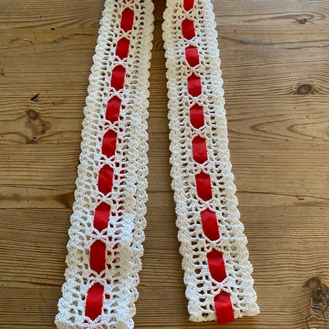 Hjemme heklet brettholder i hvit og grønn,48 cm lang .50.- SOLGT